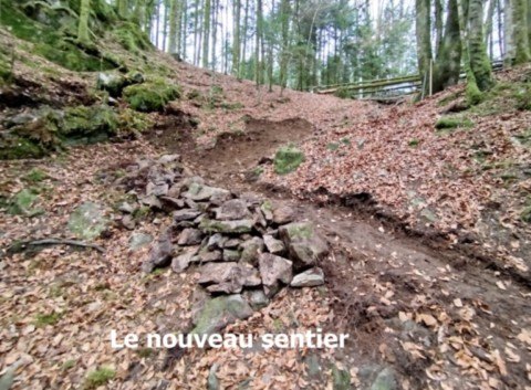 Après pas mal de coups de pioche, des grosses pierres déplacées et quelques petits arbres tronçonnés, est apparu un joli petit sentier comme on les aime, permettant de retrouver un chemin existant parallèle à la route. De plus ce nouveau tracé permet d’admirer de belles roches de grès. Il ne reste plus qu’à modifier le balisage, ce qui sera fait rapidement avec Patrick, parrain de la boucle.
