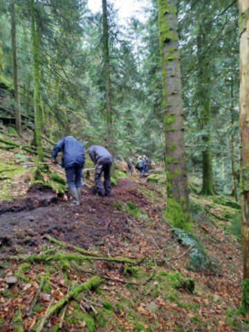 Et à nouveau, ce vendredi 25 avril, 16 personnes se sont retrouvées aux alentours de la cascade de Faymont, afin de remettre en état le sentier dégradé par des travaux forestiers: comblement des ornières, réalisation de marches d'escalier, etc... Grâce à l'efficacité de cette nombreuse équipe, composée de personnes du Club Vosgien et de Rando-Découverte, le travail fut rondement méné. A 11h, tout était terminé. Merci à eux et bravo pour cette belle collaboration.